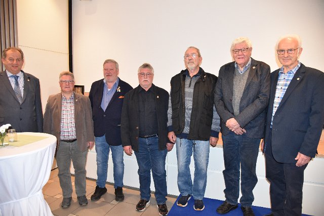 Es gratulieren Bernd Rathert (stellv. LV-Vors.); Michael Pott, Norbert Niemeyer, Gerd Homrighausen, Wilhelm Brinkwirth, Fritz Kötter mit Fritz-Dieter Hawes (LV Vors.) (v.l. n. r.)